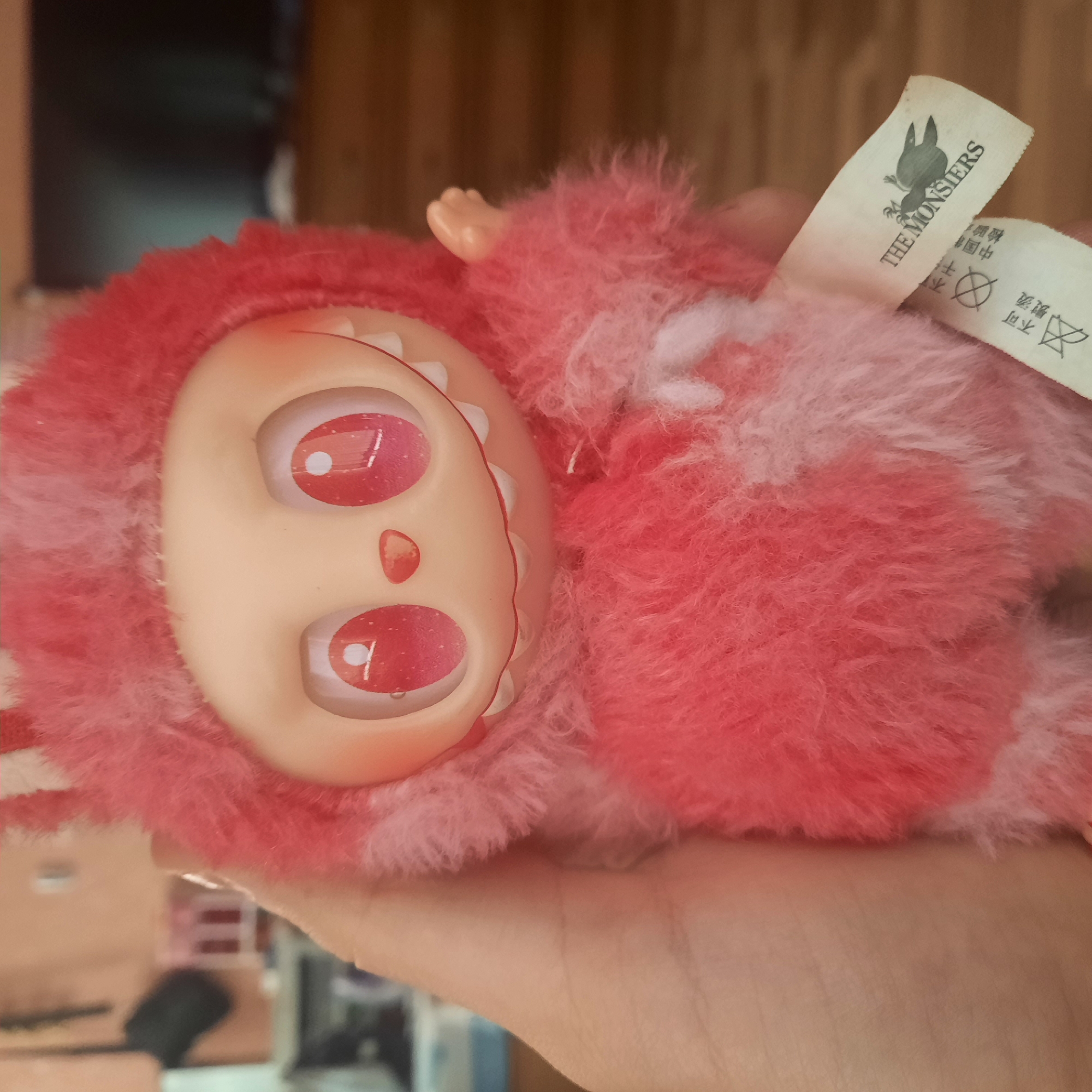 An upward-angled, close-up photograph displays a human hand holding a small, pink, furry plush toy against a blurred indoor background in Kurganinsk, Russia. The toy, identified by its tag as "THE MONSTERS," features a smooth, pale, doll-like face with prominent, glossy, dark pink eyes, a small pink nose, and a wide grin revealing multiple small, white, pointed teeth. Its body is covered in a shaggy pink fur, transitioning to lighter pink or white fur in patches, with small, pale, human-like hands protruding from its sides. A white fabric tag with black lettering and symbols is visible near the toy's lower right side. The hand supporting the toy is light-skinned, partially obscuring the toy's lower left. The out-of-focus background includes a peach-toned wall surface on the left, a dark object hanging in the upper left, and a dark, possibly wooden floor or furniture surface in the upper right and bottom right, indicating an interior setting.