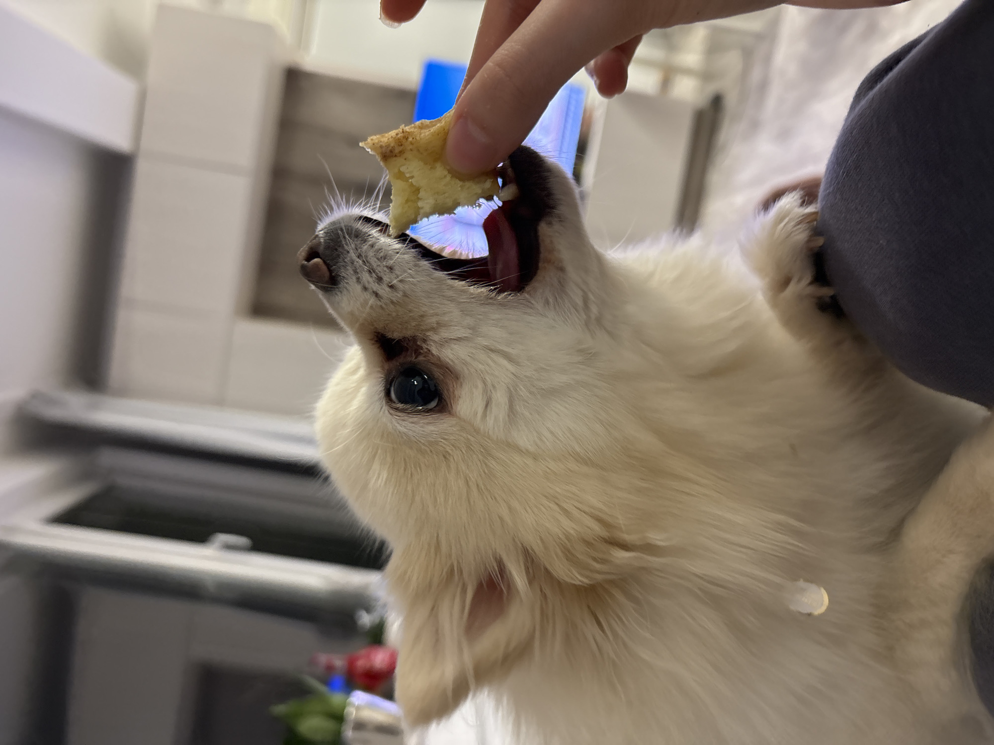 A cream-colored, long-haired dog, likely a Pomeranian or similar small breed, is captured in profile, actively consuming a small, irregular piece of light-colored food (appearing to be a baked good) offered by a human hand