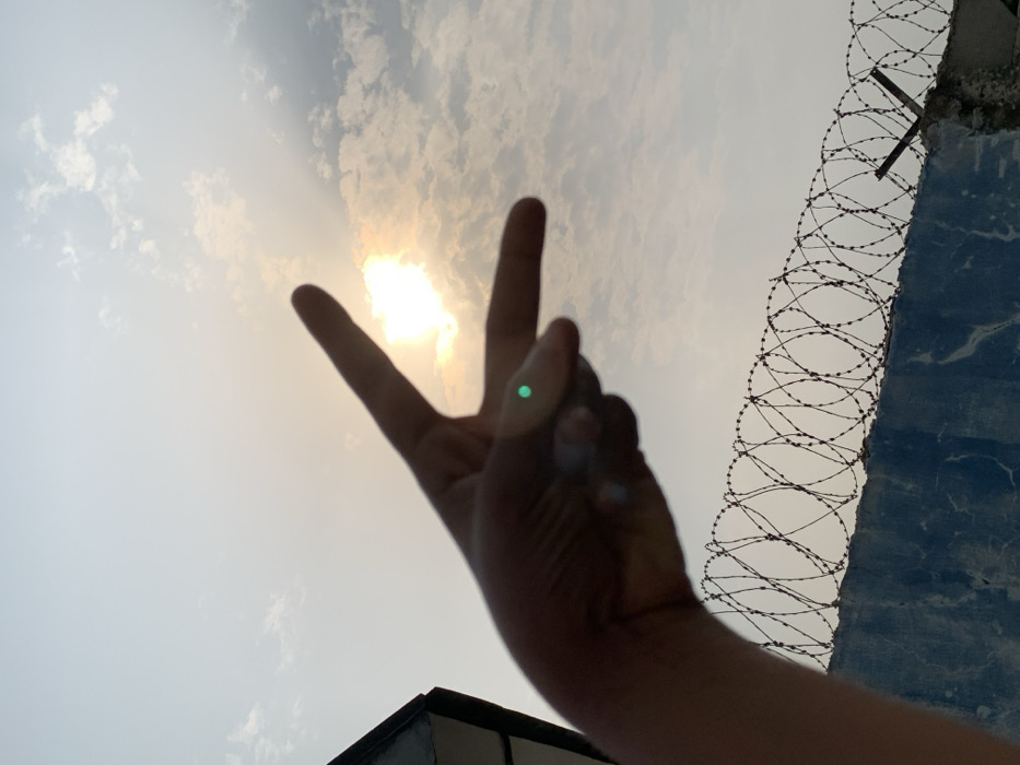 The scene depicts an outdoor environment in Ibasa, Nigeria, at a time consistent with either sunrise or sunset. In the immediate foreground, a human hand is silhouetted against the bright sky, forming a peace or victory gesture with the index and middle fingers extended upwards in a 'V' shape. A distinct green circular lens flare is present on the middle finger, with additional faint blue lens flares visible below the hand. The sun, appearing intensely bright and partially obscured by light clouds, is positioned in the upper right-center, casting crepuscular rays. The sky is a hazy light blue-grey with scattered cloud formations. Below the hand, a weathered blue-painted concrete wall runs horizontally across the lower frame, topped with multiple coils of dark concertina wire. A dark, angular architectural element, likely part of a building's roofline, is visible in the upper left corner.