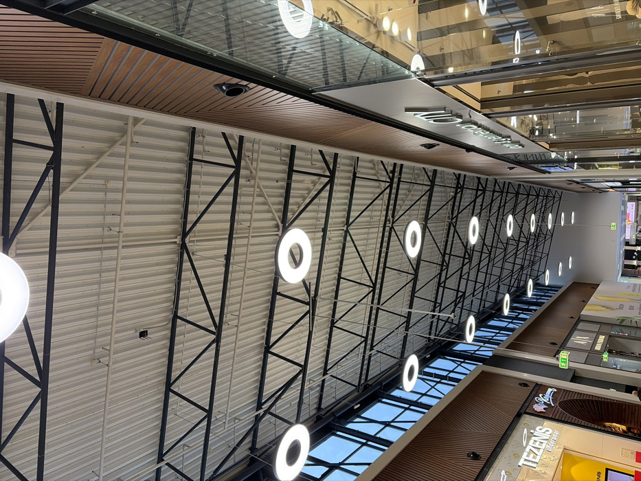 This image depicts the interior of a modern shopping center concourse in Kudrovo, Russia. The perspective is looking upwards and along a long corridor. The ceiling features an exposed, light-grey corrugated metal roof supported by black, open-web steel trusses. Numerous bright, circular LED pendant lights of varying sizes are suspended from the ceiling structure, providing illumination. A continuous strip of tall, rectangular windows runs along the upper section of the left wall, admitting natural light. The walls beneath the windows, and intermittently along both sides, are clad with vertical light-brown wooden slats and lighter panels. Storefronts with large glass windows line both sides of the corridor. On the left, the store "TEZENIS underwear" is clearly visible, with another indistinct store adjacent to it. On the right, a partial sign "CITY" is visible above a glass storefront. A black cylindrical ventilation duct is mounted on the slatted wall section on the upper right. A white security camera is suspended from the ceiling in the mid-distance. Green exit signs are visible further down the corridor. The flooring is not clearly visible but appears light-colored. The scene shows minimal foot traffic, with only the lower portion of an individual vaguely visible in the bottom left corner.