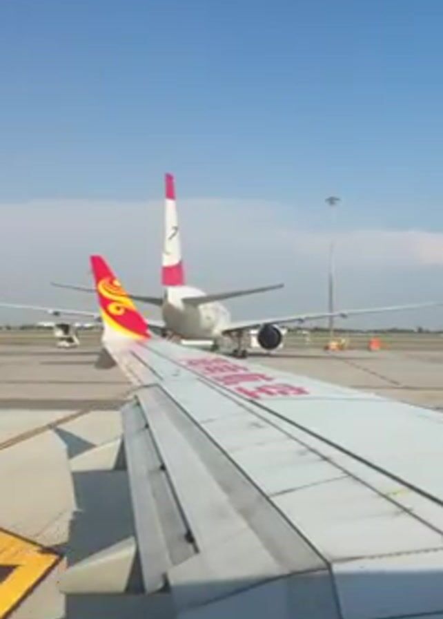 From inside a plane on the ground, looking across the wing towards another plane, also on the ground. The sky is blue with few clouds. The wings are white, with red and yellow logos on the wings. The ground is concrete with yellow lines painted on it.