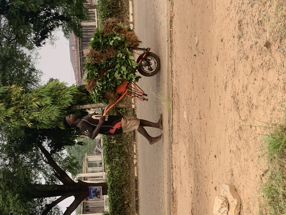 A man pulls a heavy wheelbarrow filled with leafy green plants along a paved road. The man is barefoot, wearing a dark shirt with a design and light-colored shorts. Lush green trees overhang the road on one side. On the other side is a dirt shoulder and dry grass. A building is partially visible in the background. The day appears overcast.