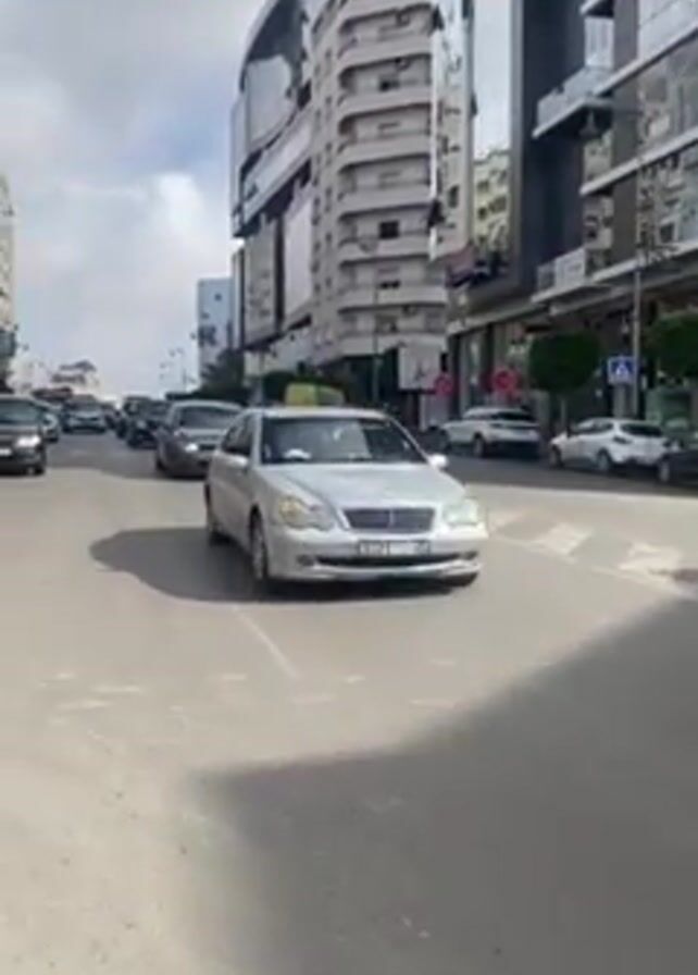 The video depicts a city street during the day. Several cars of various makes and colors drive along the road. Tall buildings line the street with shops like GIOMI, OLGA, and ARABLANCO visible. The sky is partly cloudy. There are no people visible within the frame.
