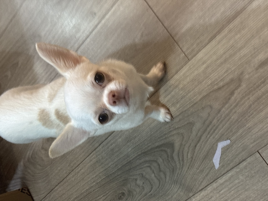 A light-colored chihuahua with brown spots is looking up at the camera. The dog is centered in the frame and its head is tilted slightly. It is standing on a wooden floor. A small piece of white paper is on the floor to the right of the dog. The background is blurred.