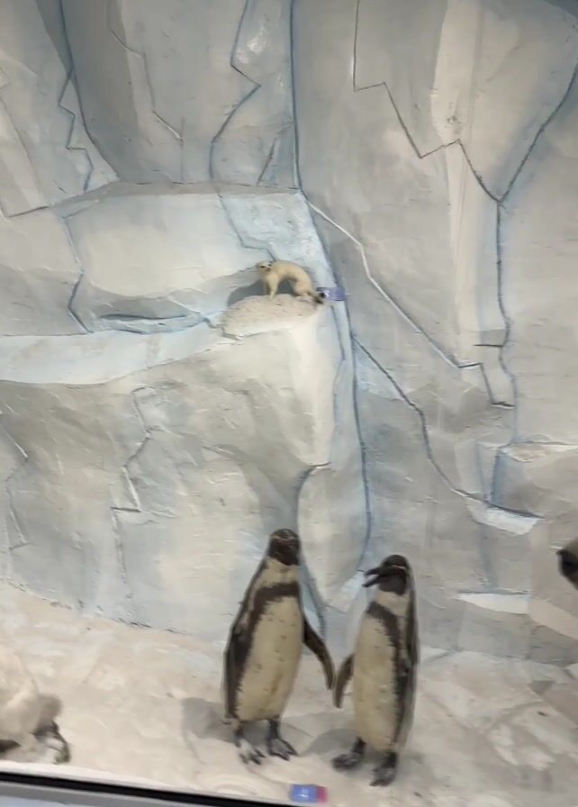 diorama of an arctic scene inside a glass enclosure, likely in a museum or exhibit. The backdrop simulates an icy environment with a white and blue textured wall. Stuffed or taxidermied animals are arranged within the scene, including two penguins standing next to each other, a polar bear head, a white fox sitting on a rocky base, a white rabbit sitting, and a small, pale animal perched on a higher ledge in the background. The camera pans across the scene, showing the different animals and the environment.