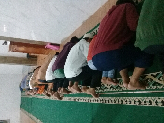 A group of 13 men are kneeling and praying on a green prayer rug with white trim. The rug is laid out in a narrow room. The men are lined up single file, facing the same direction. The men are all wearing traditional Islamic clothing, with some wearing white skull caps. One man is wearing a red shirt and blue pants, another is wearing a green shirt, and the rest of the men are wearing white shirts. A wooden lectern is to the left of the scene. The room has white tiled walls and the floor is tiled with wood planks. The location is Unknown, Unknown. The location coordinates are 666, 666.