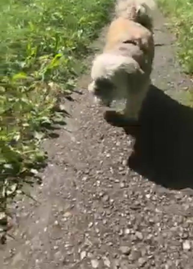 A small, light-brown dog with a harness walks along a grey gravel path lined with green grass and vegetation. The dog pauses to sniff the grass on the left side of the path. The scene is brightly lit with dappled sunlight.