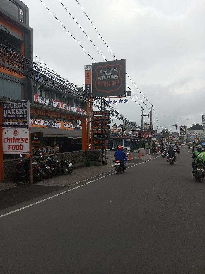 This image depicts an urban street scene, described as being in Tangsibi, Bhutan. The environment is overcast and appears to be daytime. A paved, dark asphalt road occupies the center and foreground, extending into the distance with multiple motorcycles and scooters traveling away from the viewer. On the left side of the road, a modern multi-story commercial building with dark grey and orange architectural elements is prominent. In front of and attached to this building are several signs and banners. A large, shield-shaped sign advertises "STURGIS BOUTIQUE HOTEL" with five stars below it. A separate sign reads "STURGIS BAKERY PREMIUM QUALITY SAE PULEN - RAOS." Another sign indicates "CHINESE FOOD" with an arrow pointing to "MASUK" (entry). Banners displayed on the building feature text like "I - SHABU - GRILL 131K PORSI 1-3 ORANG" and "ROTI STURGIS 2.600 SAE PULEN-RAOS," indicating various food and beverage offerings in Indonesian. A vertical sign next to the main hotel sign lists services including "STURGIS CAFE," "LUCKY GUEST HOME," "FITNESS & GYM," "SWIMMING POOL," "CHINESE FOOD," and "HO PORN LI URO." A row of approximately five to six motorcycles/scooters is parked on a paved area adjacent to the building. Numerous dark electrical or utility wires crisscross overhead. On the road, traffic consists primarily of motorcycles. A rider in a blue jacket and red helmet is centrally located in the mid-ground. To the far right, a rider wearing a distinctive green vest, typical of a ride-sharing service, is also on a motorcycle. An orange traffic cone is visible on the roadside. The right side of the street shows less detail, with more buildings and signs discernible in the distant urban landscape.