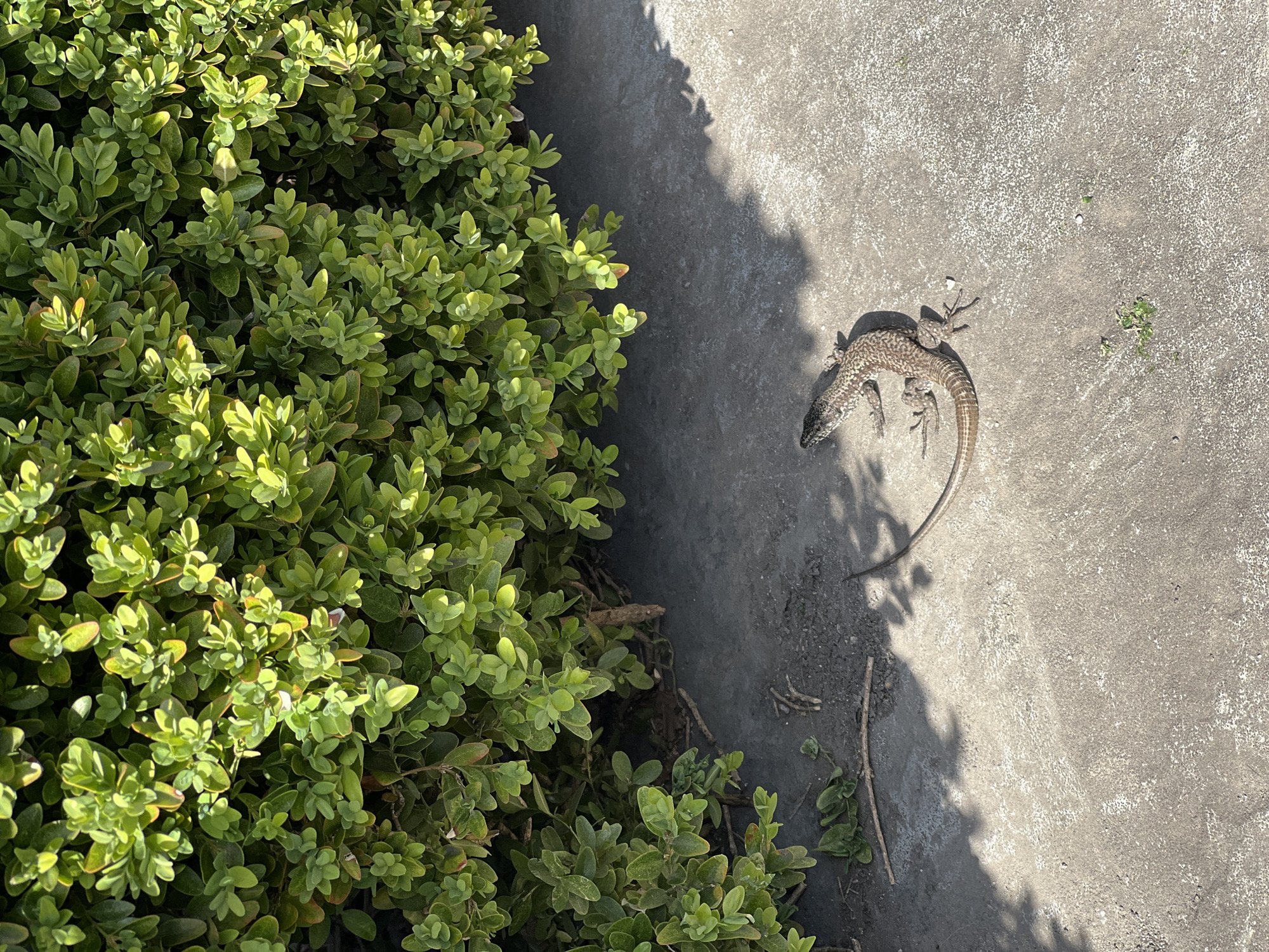 The image displays an outdoor scene in Podgorica, Montenegro. The upper two-thirds of the frame are occupied by a dense, green shrub featuring small, ovate leaves. The lower portion of the image reveals a grey, granular paved surface, consistent with concrete or asphalt, under direct sunlight. A single lizard, approximately 15-20 cm in length, is situated on this paved surface in the lower-middle area. The lizard has a mottled brown and grey pattern with darker dorsal markings, and its body is oriented with its head pointing towards the upper-left, partially illuminated by sunlight. Distinct shadows cast by the shrubbery are visible on the paved ground, primarily on the right side. Minor debris, including small twigs and sparse green plant matter, is scattered on the paved surface near the base of the shrub. No human subjects or distinct man-made structures are present within the frame.