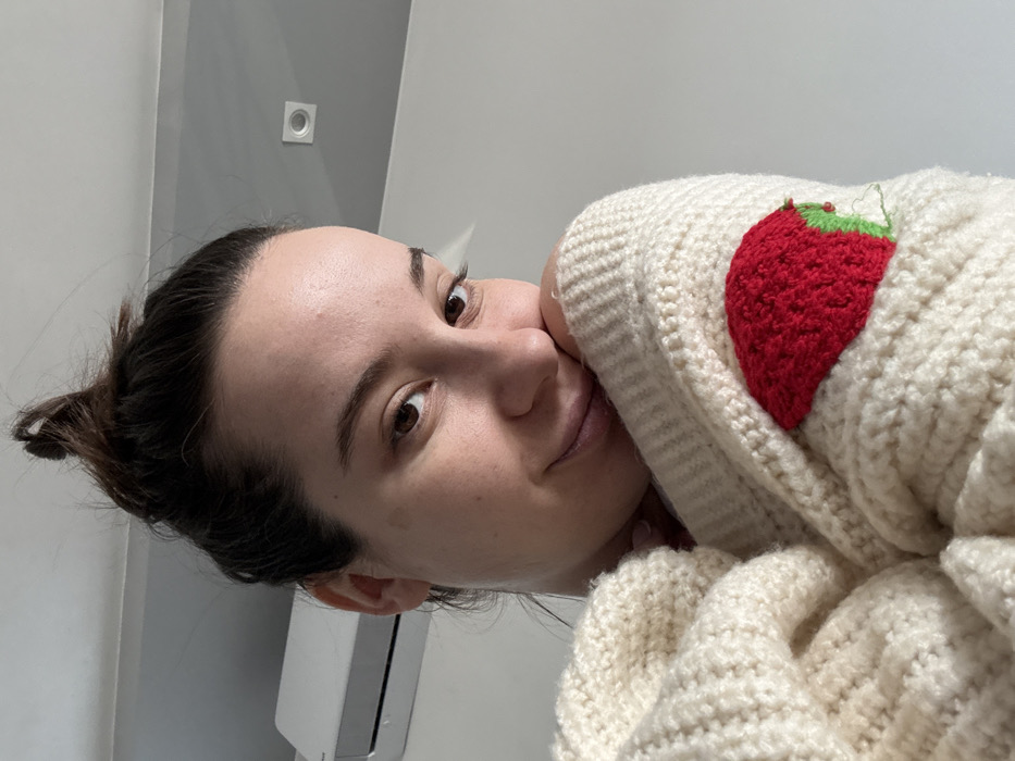 A female subject is depicted in a close-up, chest-up portrait within an interior setting in Sofia, Bulgaria. She has dark hair secured in an untidy bun, fair skin with a visible hyperpigmented mark on her left cheek, and brown eyes directly engaging the camera. Her lips form a slight, closed-mouth smile. She wears a cream-colored, heavy knit sweater featuring a distinct red, green, and white strawberry appliqué on the upper right sleeve. Her right hand is positioned near her right shoulder. The background consists of a plain light-colored wall and ceiling. A white split-system air conditioning unit is partially visible mounted on the wall to the left, and a single square recessed light fixture is present on the ceiling to the right.