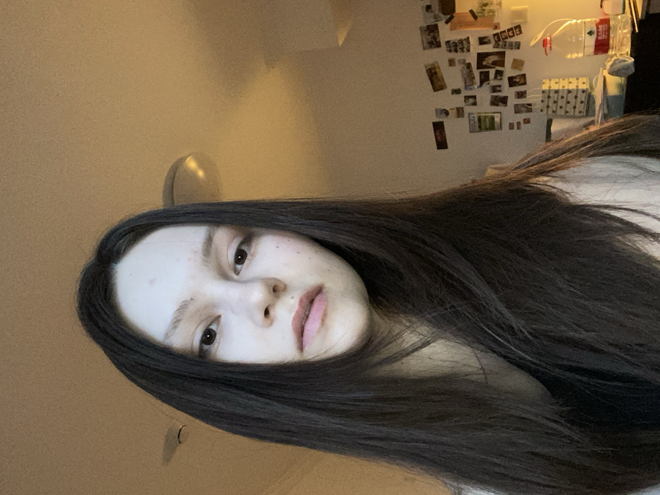 The scene depicts an individual inside a room located in Haidian District, China. The primary subject is a young female presenting with fair skin and long, straight dark brown hair, parted centrally, framing her face. She has dark eyes and a neutral facial expression, with her lips slightly parted. Visible on her skin are minor blemishes, specifically on the forehead and cheeks. She is wearing a dark-colored garment, possibly a tank top, visible beneath her hair, and a light-colored garment appears on her right shoulder (viewer's left). The individual is positioned centrally, gazing directly forward into the camera, indicating a self-portrait. The background reveals an indoor domestic setting. The ceiling is a light, warm color, featuring two visible ceiling-mounted light fixtures, one circular and emitting a warm glow, and another smaller white circular object. The wall to the right of the subject is also light-toned and extensively covered with a collage of various paper items, including photographs and postcards, affixed to its surface. Below the collage, on a dark surface, a clear plastic bottle with a red cap is prominent, bearing the Chinese characters "农夫山泉" (Nongfu Spring). Adjacent to it are other indistinct objects, including a patterned white bag and a warm light source, possibly a desk lamp, illuminating the area. The overall lighting is warm artificial light.