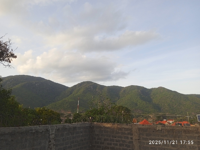 The scene, located in Namanga, Kenya, was recorded at 17:55 on November 21, 2025. The foreground is occupied by a gray concrete block wall, exhibiting an unfinished or utilitarian appearance. Immediately behind this wall, a security fence topped with razor wire extends across the mid-ground. Further back, a town or settlement is visible, characterized by buildings with red-tiled roofs amidst green foliage. A prominent red and white striped pole, possibly a telecommunications mast, stands vertically in the mid-ground. A small solar panel array is mounted on the right, above the concrete wall. The background consists of multiple densely vegetated hills, forming a continuous ridge. The sky above is partly cloudy, displaying patches of pale blue and scattered gray clouds. A barren tree branch partially enters the frame from the upper left. No people are present or engaged in any activity.