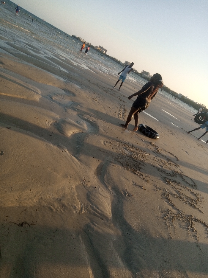 The image depicts a beach scene in Shanzu ward, Kenya, during late afternoon or early evening, evidenced by long shadows and warm sunlight