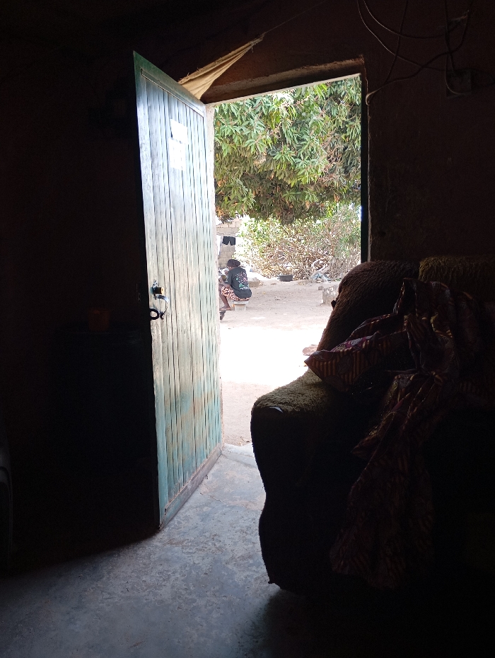 The image depicts an interior view looking out through an open doorway into an outdoor environment in Reifild-Ist, Nigeria. **Interior (Foreground):** The scene is shot from a dark, earth-toned room with a light grey concrete floor. To the right, a dark, possibly olive-green upholstered armchair or sofa is partially visible, with a patterned, reddish-brown fabric draped over it. To the left, a light blue-green wooden plank door, with a dark handle, is open, revealing the exterior. Above the doorway, an irregular piece of light-colored fabric or sacking is visible, along with dark electrical wiring in the upper right corner. **Exterior (Background):** Beyond the doorway, a brightly lit outdoor area is visible. A person, dressed in a dark patterned shirt and lighter bottoms, is seated on a low stool or block on the dirt ground, facing slightly away from the camera and appearing to focus downwards. To their left, a piece of white clothing hangs on a line. Lush green foliage from a large tree dominates the upper exterior view, while dry brush and smaller plants are present at ground level. Several dark, indistinct objects, possibly containers, are scattered on the dirt ground near the seated individual and further into the scene. No active interactions are discernible between people.