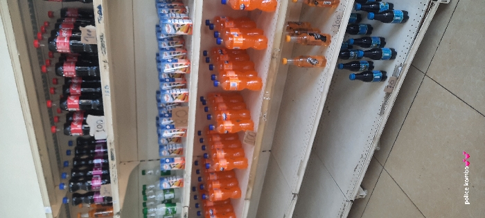A tilted shot reveals store shelves stocked with a variety of bottled beverages. Coca-Cola bottles occupy the top left, followed by blue-and-white labeled drinks. Orange-colored soda fills the middle shelves. Smaller bottles of orange soda are beside them. The bottom shelves display water bottles and an additional assortment of blue-capped drinks. Price tags are visible on some shelves, providing a glimpse into the cost of each item.