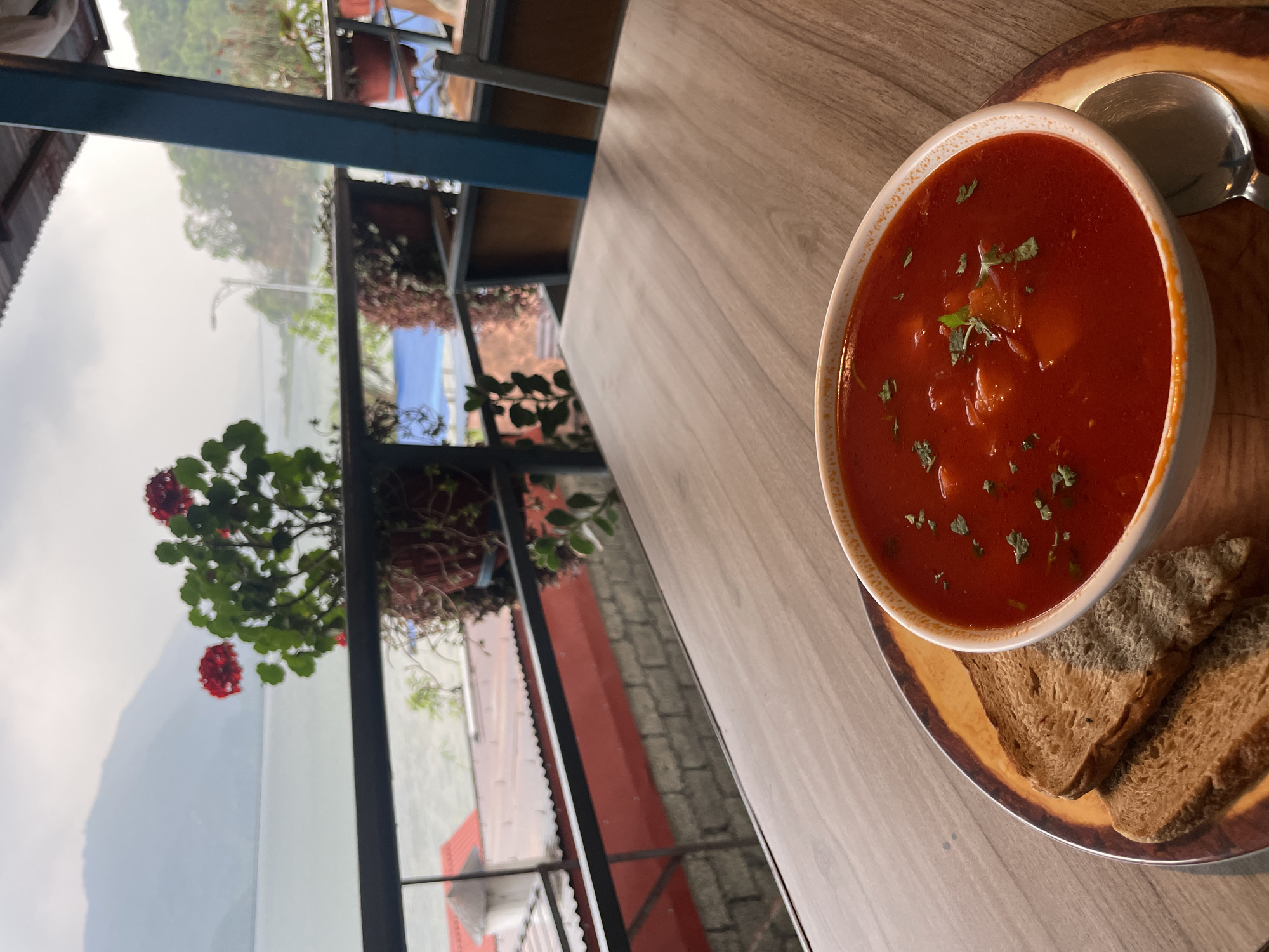 The scene captures a bowl of red soup, possibly tomato-based, garnished with green herbs and accompanied by several slices of dark bread. The soup sits in a white bowl placed on a wooden serving plate, which is positioned on a light wooden table. A metallic spoon is seen behind the soup bowl. Through a nearby window, the environment outside features flowers, a structure with a red roof, and a mountain visible in the distance, partially obscured by overcast weather. The presence of flower planters and architectural details suggests a building with balconies. The location can be identified as Pokhara, Nepal, due to the visible mountainous landscape and regional architectural styles.