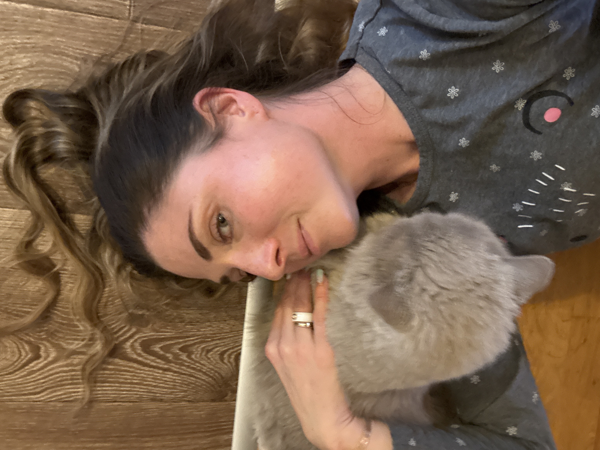 - "A woman is lying on a wood-look floor, embracing a gray, fluffy cat" by FM-hPg8L2, licensed under CC BY 4.0