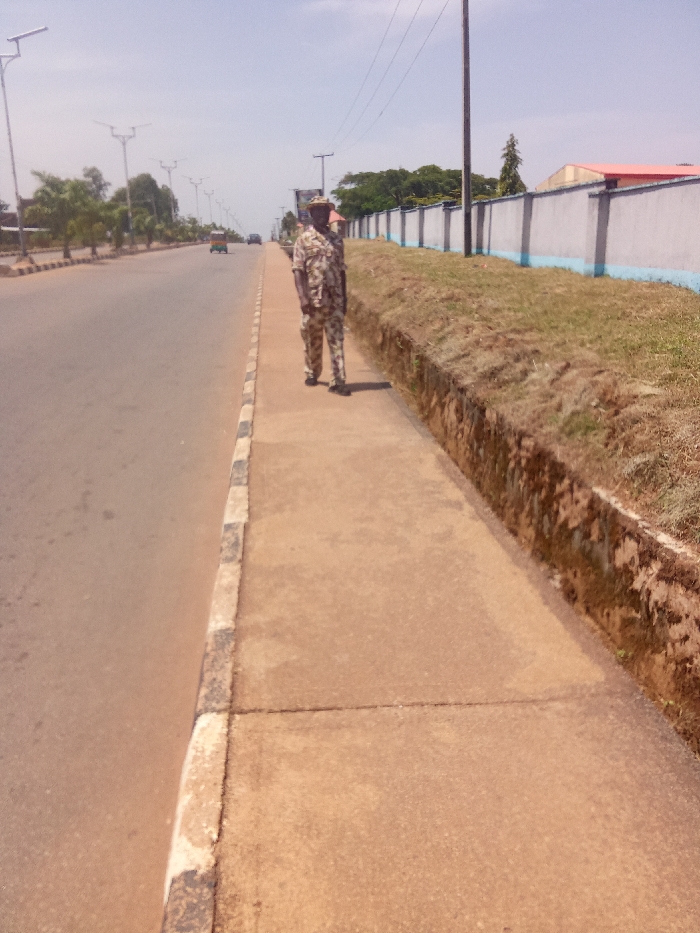 The image depicts a daytime street scene in Barakin Lerawi, Nigeria, under a bright, partly cloudy sky. A male individual, appearing middle-aged and of dark complexion, is walking on a light-colored concrete sidewalk, moving away from the viewer towards the background. He is wearing a full camouflage uniform, consisting of a shirt, trousers, and a matching cap, in a green, brown, and tan pattern. His shadow is cast to his left. To the immediate left of the sidewalk is a paved asphalt road, delineated by a black and white striped curb. Along the left side of the road, a series of modern streetlights, each equipped with solar panels, are visible, interspersed with several trees. In the distant background on the road, a three-wheeled vehicle and another car are present. To the right of the sidewalk, an open drainage ditch with exposed reddish-brown earth walls and sparse green vegetation runs parallel. Beyond this ditch, a strip of neatly trimmed grass precedes a long, low white wall. This wall features a light blue horizontal stripe near its base and extends into the background, enclosing a property. Portions of trees and a building with a red roof are visible behind the wall. Overhead power lines are stretched across the upper right quadrant of the image, supported by poles.