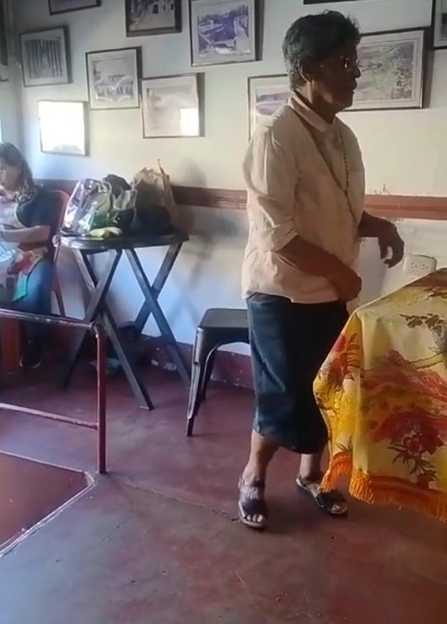 senior woman in a peach colored button-up shirt, a long denim skirt, and sandals standing in a room. She is wearing glasses and a necklace with a cross. She gestures with her hands as she appears to be speaking to someone off camera. Behind her is a wall covered with framed photographs. To her left, there's a small table with a bag and other items on it, and a woman seated behind it. To her right is a table covered with a colorful floral tablecloth with fringe. The floor is reddish brown and the room appears to be a gallery or museum. The lighting is bright.