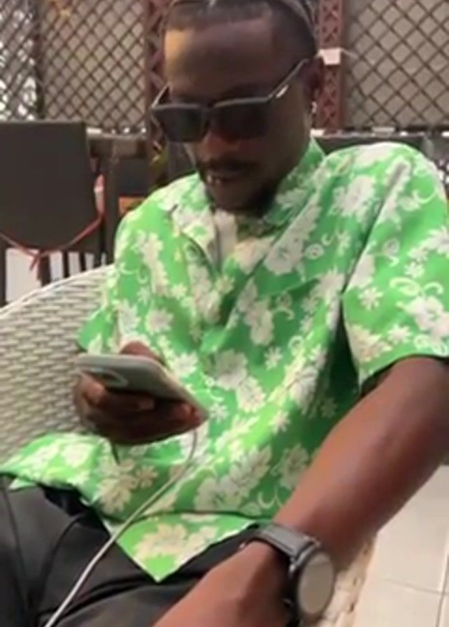 A medium shot shows a Black man with dark sunglasses, a green and white patterned shirt, and a black watch on his left wrist, sitting in a white wicker chair