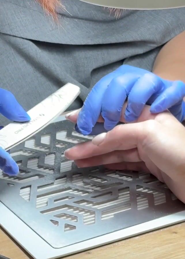 Here's a concise description of the video: The video shows a manicurist wearing blue gloves filing a client's nails at a table