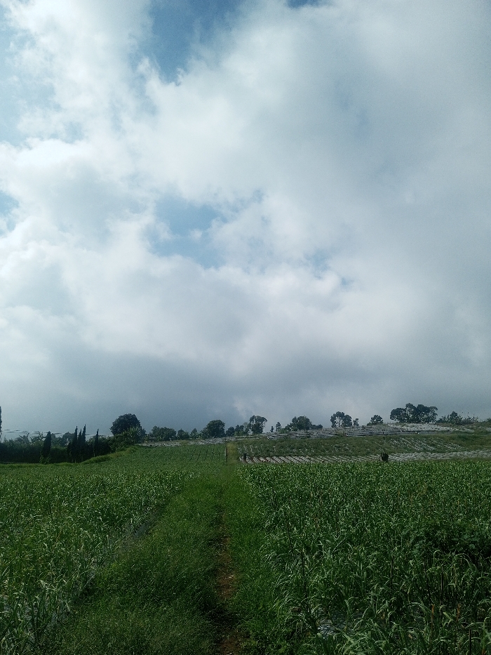A vast green field stretches under a cloudy sky. Rows of crops fill the foreground, divided by a narrow grassy path. In the distance, a line of trees and shrubs sits on a gentle slope, with a cloudy sky above them. Patches of blue sky peek through the clouds. The scene evokes a sense of tranquility.