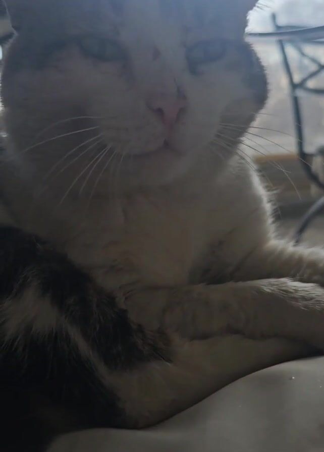medium close-up of a cat sitting on a white cushion. The cat is mostly white with some gray and brown patches. The cat looks towards the camera, up, to the side, and then down. The background is bright, with a window and a metal chair partially visible. The lighting is diffused.