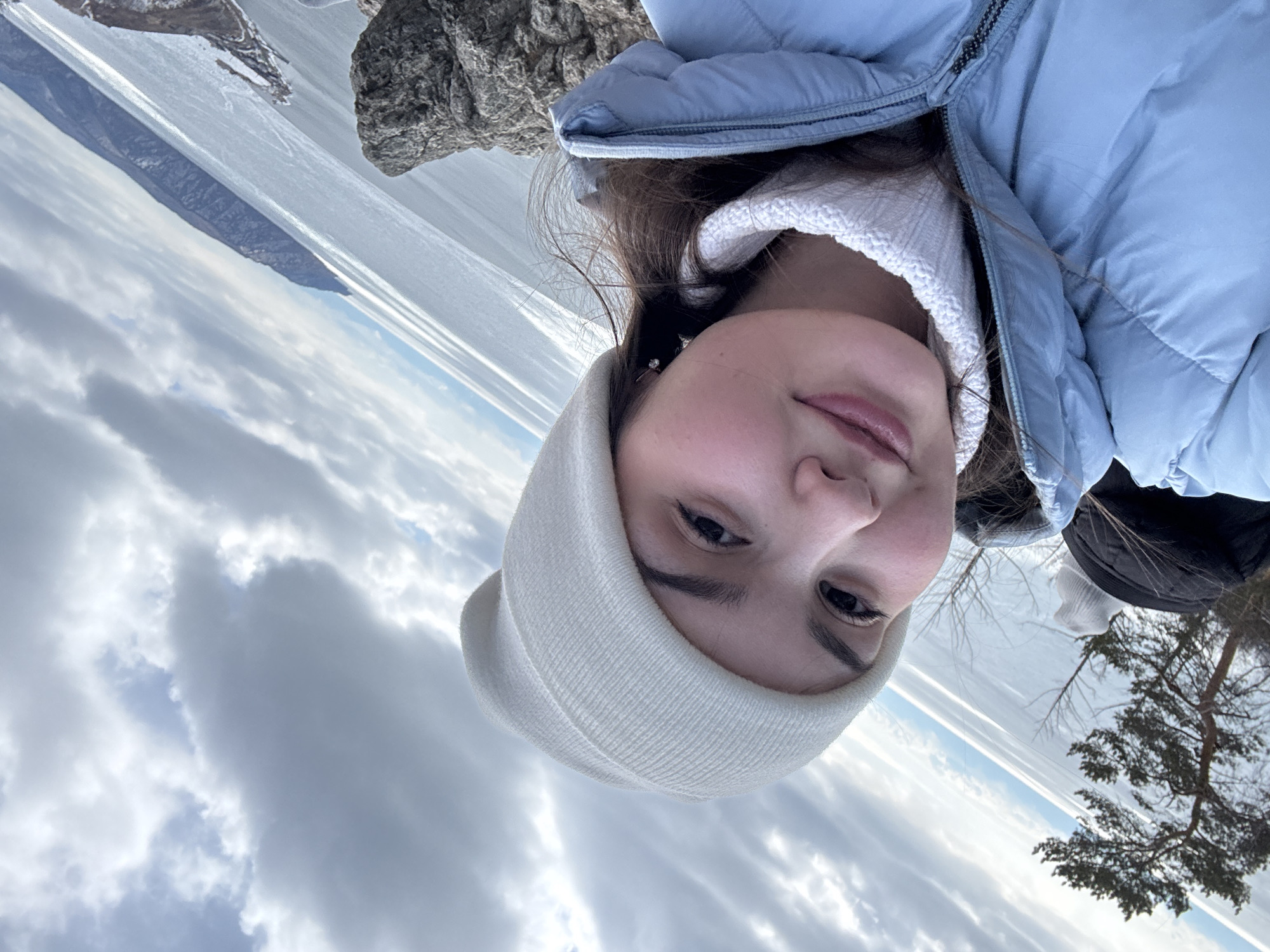 A young female, positioned centrally and slightly angled, occupies the foreground of a selfie-style image taken in Nikola, Russia