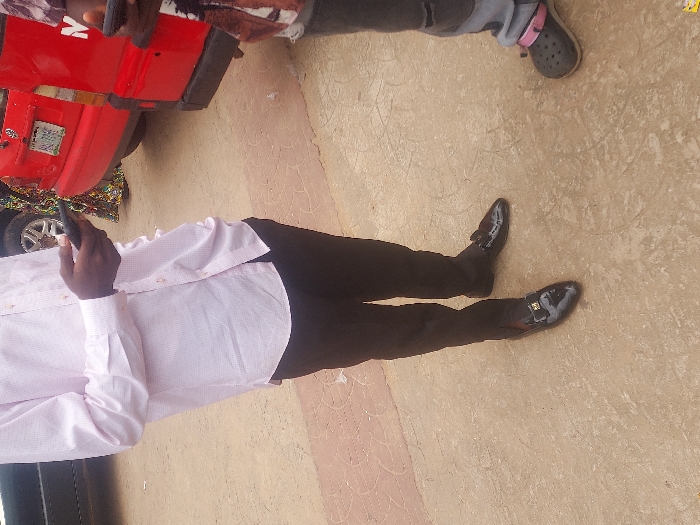 The scene depicts an outdoor urban environment in Onitsha, Nigeria, indicated by a Nigerian license plate from Anambra State. In the foreground, a person is observed from the mid-torso down, wearing a light pink long-sleeved button-up shirt and black trousers. This individual holds a black smartphone with both hands, positioned in front of their torso, with their left hand partially in their left trouser pocket. They wear shiny black patent leather loafers adorned with a gold-colored buckle. To the right, the lower leg and foot of a second individual are visible, wearing light grey ripped jeans and a black Croc-style clog with a pink heel strap. In the background, a red commercial vehicle or minivan is parked, displaying a Nigerian license plate with the registration "ASL 109GG" or similar characters. A tire from a dark vehicle is partially visible to the left of the red vehicle. The ground consists of light brown and reddish-brown concrete paving.