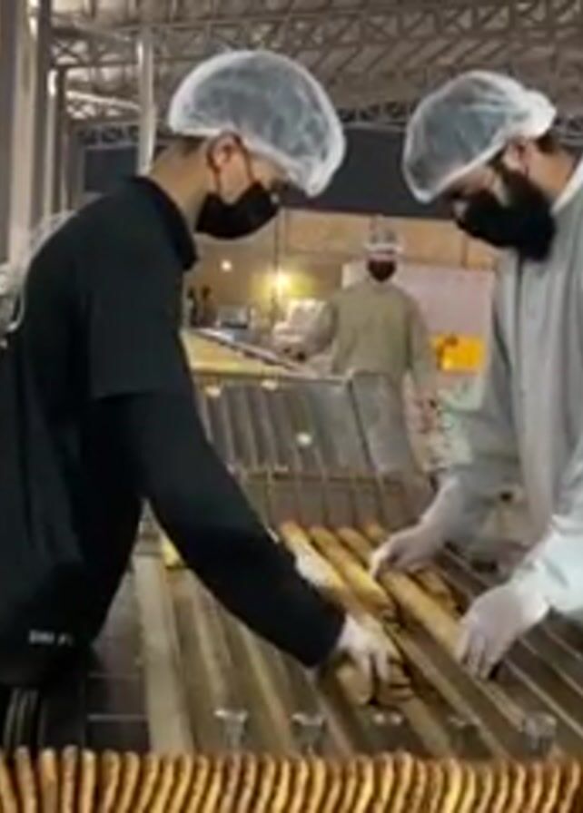 three workers in a food production facility. All three are wearing hairnets and face masks. One worker is wearing a black shirt and the other two are wearing traditional Middle Eastern clothing. The workers are standing at a conveyor belt that is moving baked goods, which appear to be cylindrical cookies or sticks. The workers are wearing gloves and appear to be inspecting and possibly sorting the baked goods as they move along the conveyor belt. There are stacks of boxes or crates in the background, and more of the baked goods are visible at the end of the conveyor belt. The lighting is bright and industrial.