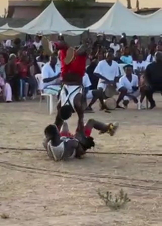 two male acrobats performing a balancing act in front of a large audience. The acrobat on the bottom is standing and supporting the other acrobat on his shoulders, who is performing a handstand. They are both wearing traditional African clothing. The audience is seated on chairs and benches. The background includes white tents and buildings under a dusky sky. There are also musicians playing drums in the background.