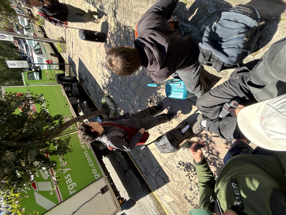 A group of people gathers outdoors on a sunny day near a parked green truck. One person lies on the ground. Others sit or stand, with backpacks and luggage nearby. A person holds a phone, possibly taking a photo. The area appears to be a sidewalk or paved area, with trees and other vehicles visible in the background.