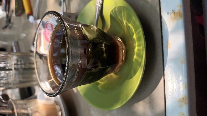 A glass coffee cup rests on a green saucer with a spoon inside. Dark liquid fills the glass. Light creates a halo effect around the saucer, casting a shadow. Other glasses and utensils are visible in the background. The scene is set on a weathered surface with discoloration.