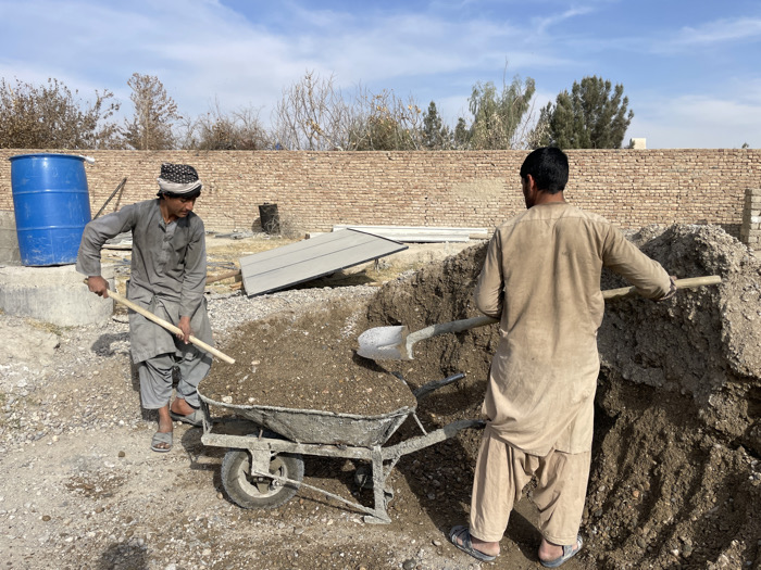 The image displays two adult males engaged in manual earth-moving at an outdoor site in Nakhonay, Afghanistan