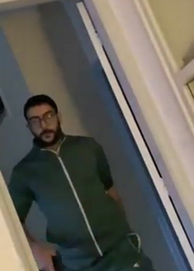 A man with a beard and glasses walks through a doorway. He is wearing a green tracksuit. He walks into a room where another man is sitting on a couch and looking at a laptop. The second man is wearing a red shirt and white headphones. The first man stands over the second man.