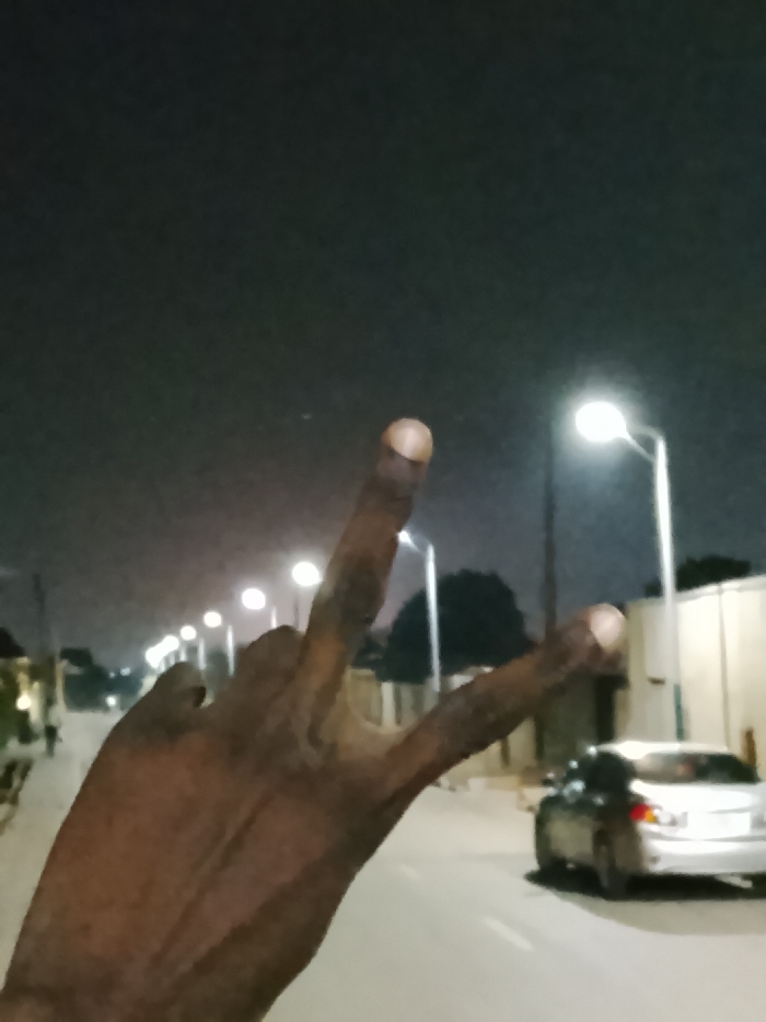 The image depicts a nighttime scene on a street in Narayi, Nigeria. In the immediate foreground, a dark-skinned right hand is visible, performing a gesture with the index finger and pinky finger extended upwards, while the thumb, middle, and ring fingers are curled. The background shows a paved road with faint white lane markings illuminated by a series of streetlights extending into the distance. A silver or light-colored sedan is partially visible on the right side of the road, facing away from the viewer. Dark foliage and indistinct building structures line both sides of the street under the dark night sky.