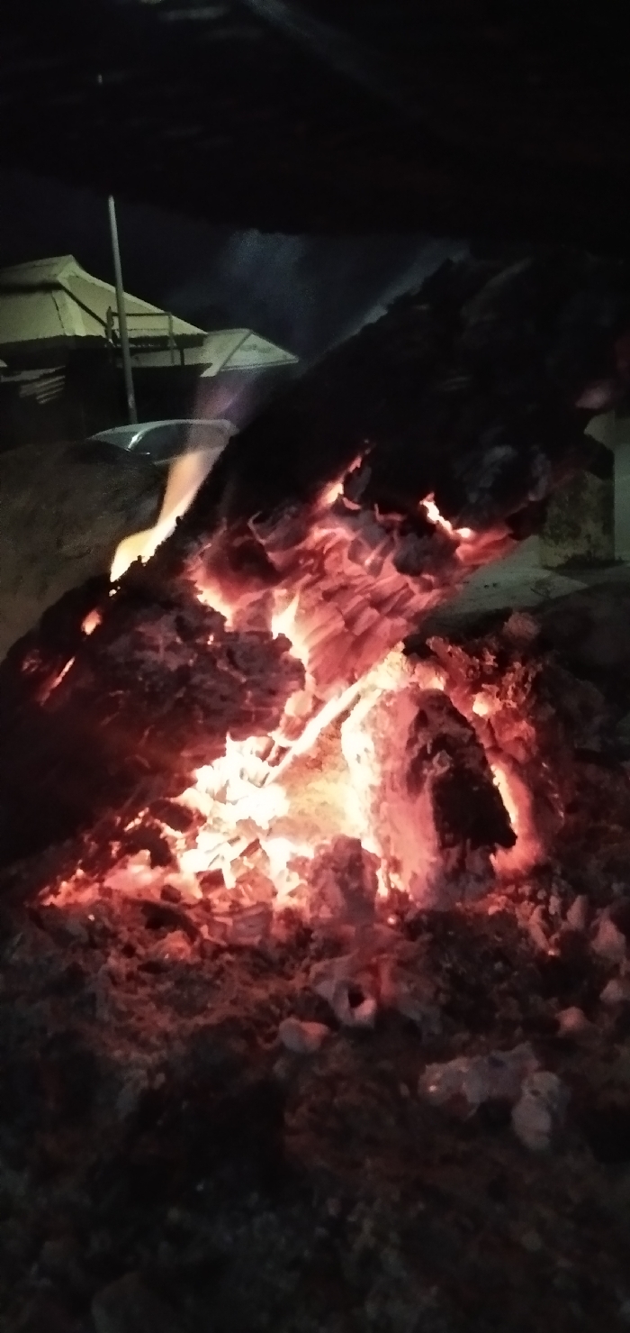 A vibrant bonfire glows intensely, illuminating charred wood and ashes. The fiery core emits a bright orange and red light, contrasting with the dark, rough texture of the surrounding material. In the background, blurred shapes hint at a structure with multiple roofs and a slender, vertical pole. A dark ambiance envelops the scene, emphasizing the warmth and power of the fire. A faint glint suggests a vehicle nearby.