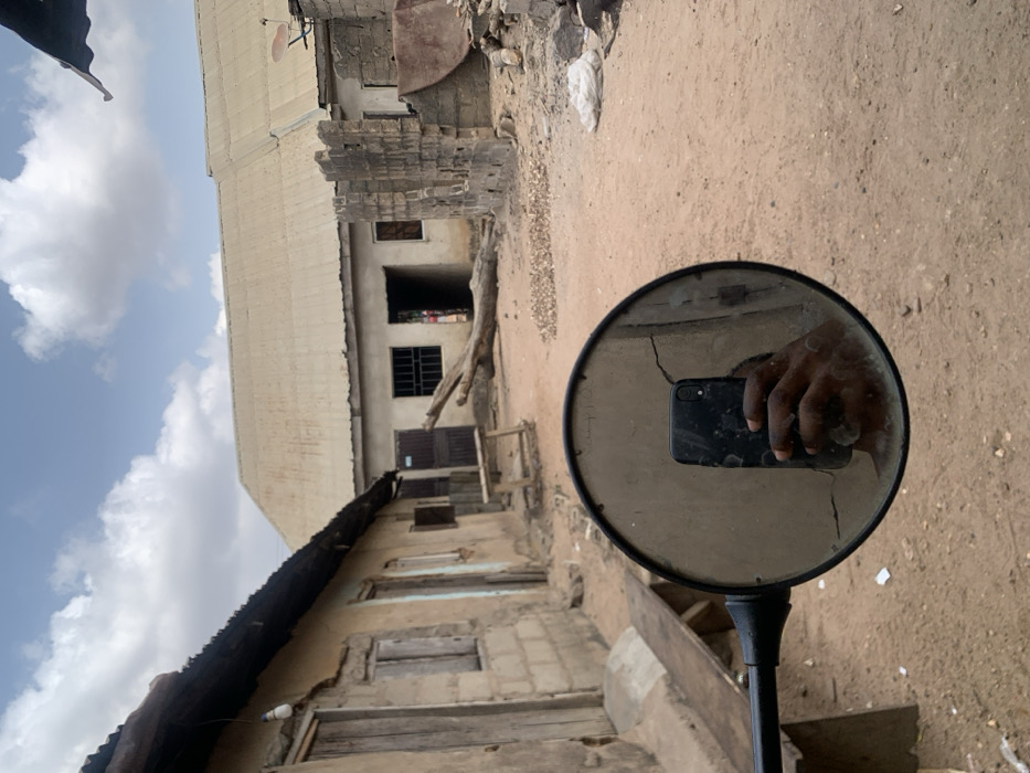 The scene depicts an outdoor residential or communal area in Lokoja, Nigeria, under a sky with scattered white clouds. In the foreground, occupying the lower-left, a circular, dark-rimmed mirror with visible dirt and a crack in its lower-left quadrant reflects a dark-skinned hand holding a black smartphone with a dual camera system. The smartphone is pointed towards the mirror, with its screen appearing dark. The ground throughout the visible area is unpaved, consisting of reddish-brown dirt and sand. To the left, a single-story structure with weathered, unpainted concrete block walls and a dark, possibly corrugated metal roof is present. This building features multiple wooden doors and windows, and a single bare light bulb hangs by a wire from its roof overhang. A simple wooden bench is positioned in front of this structure. In the midground and background, across an open dirt expanse, another single-story building with a light-colored corrugated metal roof stands. This building appears to have light-toned plastered walls, multiple windows equipped with security bars, and several wooden doors, including a double-door entrance. A large, bare tree trunk lies horizontally on the ground in front of this building. To the right of the second building, partial walls of an unfinished or structurally compromised concrete block building are visible, alongside a large, curved piece of rusty metal. A small pile of light-colored aggregate material, possibly gravel or small stones, is situated on the dirt ground between the two main structures. A crumpled white plastic bag is visible on the far right of the scene.