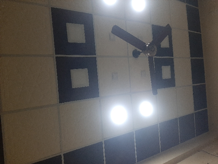An upward-angled photograph captures an interior ceiling within Barza Municipality, Syria. The ceiling features a grid system composed of alternating light-colored and dark-colored square tiles. Four bright, circular recessed light fixtures are active, alongside two smaller, square recessed lights embedded within dark tiles. A dark-bladed ceiling fan with a metallic central housing is suspended from the ceiling, appearing stationary. No individuals, explicit actions, or interactions are present in the scene, which depicts an illuminated, tiled indoor space.
