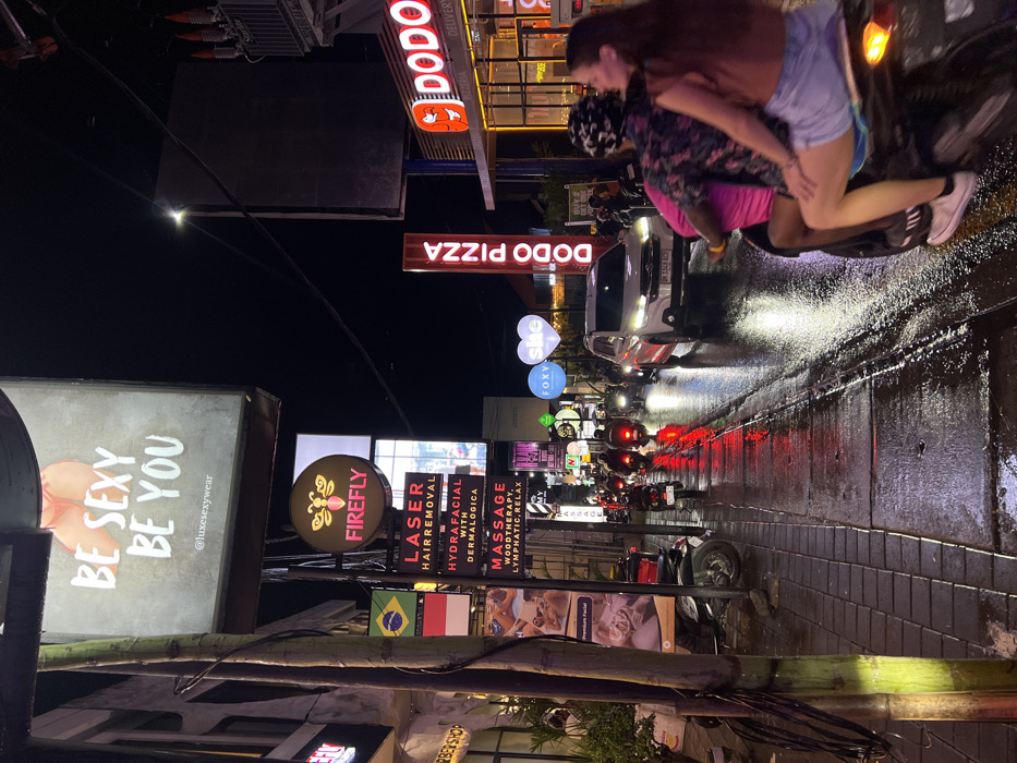 A nighttime urban street scene is depicted in Tibubeneng, Indonesia, characterized by a wet, reflective asphalt road and brick-paved sidewalk, suggesting recent rainfall. Artificial light emanates from numerous commercial signs and streetlights against a dark sky. In the immediate foreground, two individuals are seated on a dark-colored scooter, moving away from the viewer. The passenger, a female with visible long brown hair, wears a light brown top, light blue denim shorts, and white athletic shoes. The driver, largely obscured, wears a patterned shirt and a dark head covering, with a distinct pink undergarment visible on the right arm. To the left, a robust wooden pole supports multiple illuminated signs. The uppermost sign reads "BE SEXY BE YOU" with "@luxesexywear." Below it, a circular sign displays a stylized firefly logo and the name "FIREFLY." Further down, three smaller rectangular signs advertise "LASER HAIR REMOVAL," "HYDRAFACIAL WITH DERMALOGICA," and "MASSAGE WOODTHERAPY, LYMPHATIC, RELAX." Two national flags, specifically Brazil and Indonesia, are also affixed to the pole. The street is populated with multiple vehicles, predominantly motorcycles, whose red taillights create streaks of light on the wet surface. A light-colored SUV is visible in the mid-ground, traveling in the same direction. On the right side of the street, a building houses "DODO PIZZA," identified by its large red and white signage featuring a stylized Dodo bird mascot. A tall, vertical illuminated sign reading "DODO PIZZA" stands nearby. Further down the street, additional illuminated signs are visible, including a circular sign with "Foxy" and a heart-shaped sign displaying "she." Overhead, visible electrical wiring connects poles and buildings.