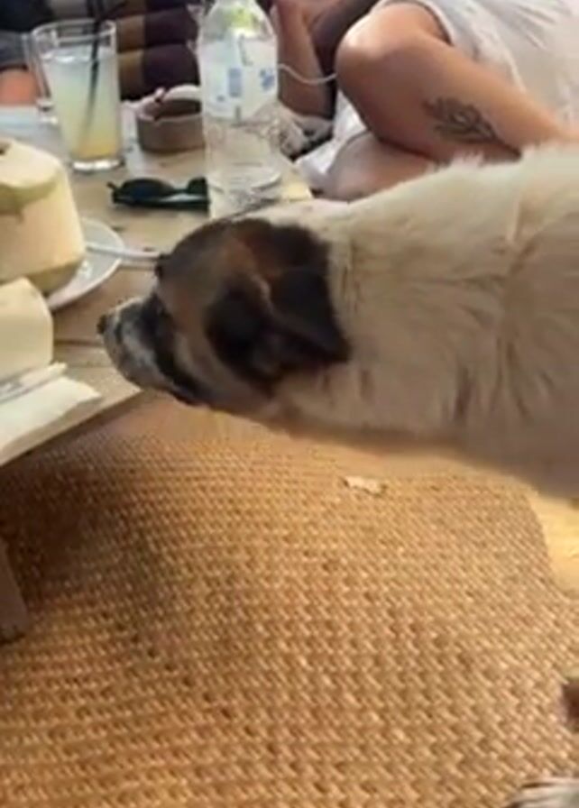 The camera shows a medium-sized dog with mostly white fur and dark markings on its head, sniffing at the edge of a wooden table on a woven mat. The table has a coconut, a drink in a glass, a water bottle, and other items. Behind the dog, two individuals are visible. One is lying down, wrapped in a white cloth, with a visible tattoo on their upper leg and holding what appears to be a cigarette. The other individual is in the background, using a mobile phone. The environment appears to be an outdoor seating area with cushions and greenery overhead.