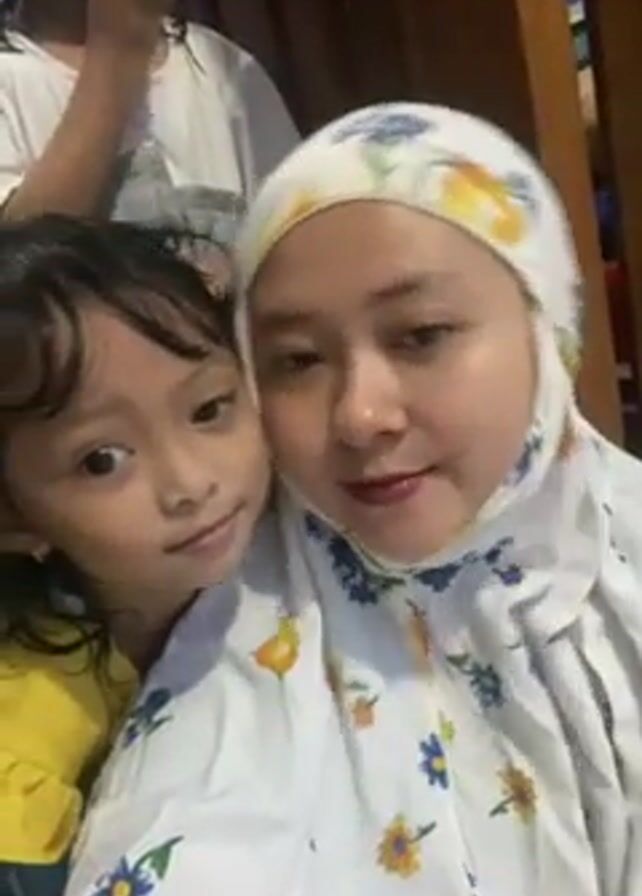 A woman in a white floral hijab is taking a selfie. To her left, a young girl with dark hair and a yellow shirt kisses her cheek. Behind them, a third girl in a white shirt looks towards the camera. They appear to be indoors, with a wooden door or wall visible in the background. The woman makes a kissy face for the camera.