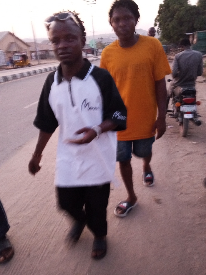 Three men walk along a dusty road. One wears a white polo shirt with black sleeves and dark pants. The second wears a bright orange t-shirt and denim shorts. Both men wear casual sandals. A third man, wearing a gray shirt, sits on a parked motorcycle behind them. The background features a road, buildings, and a blue sky. The photo appears to be taken at eye level with a slightly blurred effect due to the subjects' motion.