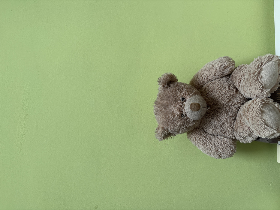 The image depicts an indoor scene in Barcelona, Spain. A brown plush teddy bear is seated upright, facing forward, in the lower center of the frame, positioned against a solid, textured, light green wall. The bear has shaggy, medium-brown fur, a prominent oval-shaped dark brown nose, and small dark eyes partially obscured by its fur. It appears to be resting on an unidentifiable dark surface, with a thin white horizontal line visible at the very bottom edge of the frame. No distinctive architectural features, landmarks, or external elements are present within the visual information to identify a specific address or neighborhood within Barcelona. The scene is static, devoid of human presence or any discernible action.