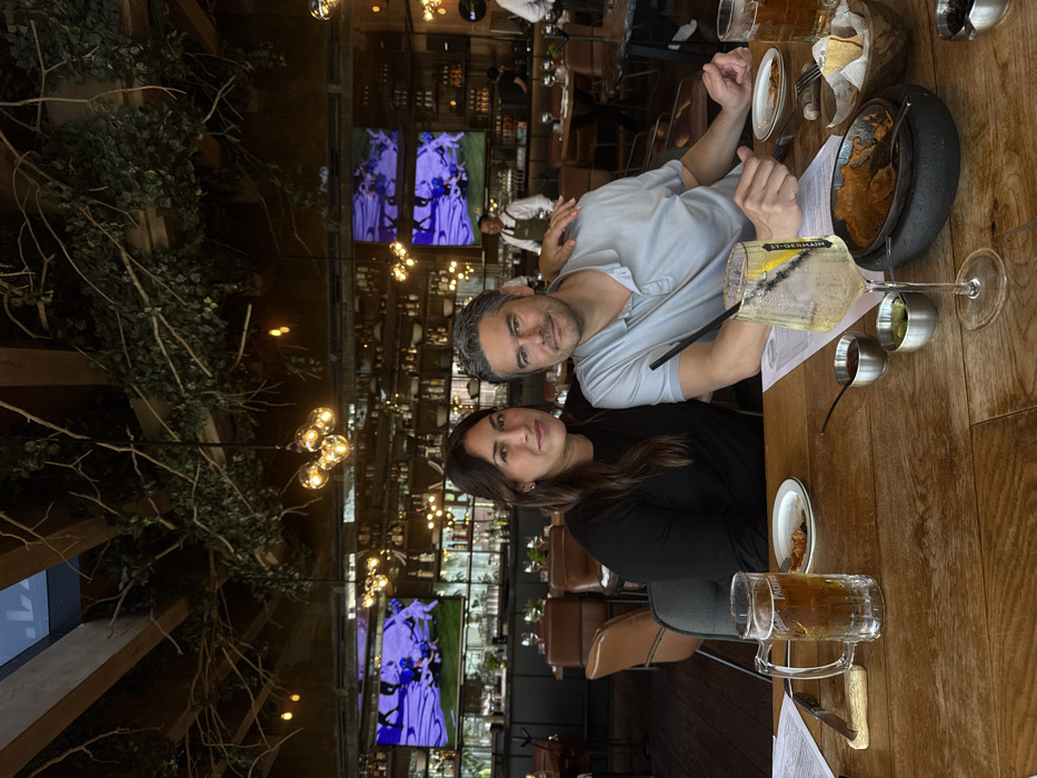 A man and woman pose at a wooden table in a restaurant. The man, with short grey hair, wears a light blue shirt. The woman is wearing a black shirt. A tall glass of sparkling beverage sits on the table with a beer. Food is in a black skillet. The restaurant has a busy interior, decorated with greenery, and a TV showing a sporting event. Lighting fixtures with multiple bulbs add to the ambiance.