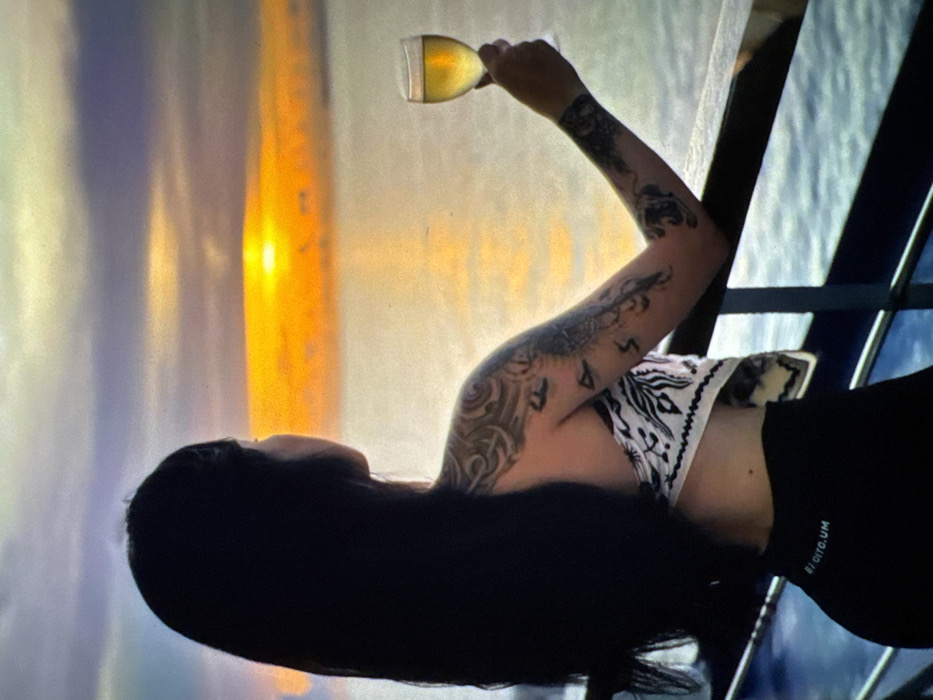 A sole female subject is observed from a rear-right perspective, standing on what appears to be a deck or balcony, overlooking the Atlantic Ocean at sunset from a coastal vantage point in or near Funchal, Portugal. She possesses long, dark hair extending below her waist. Extensive tattoos adorn her right arm and shoulder, depicting dark, intricate designs, including geometric patterns and symbolic runes. Her attire consists of a white and black patterned bandeau top, exposing the midriff, and black form-fitting bottoms (leggings) with the white text "EI.OITO.UM" visible on the upper left rear. In her raised right hand, she holds a stemmed glass containing a light yellow liquid, consistent with wine. Her left arm rests on a dark-colored, horizontal railing. The background is dominated by a vivid sunset, featuring a bright orange sun positioned low on the horizon, casting a luminous golden reflection across the water's surface. The sky exhibits color gradients from intense orange at the horizon to purple and grey in the upper regions.