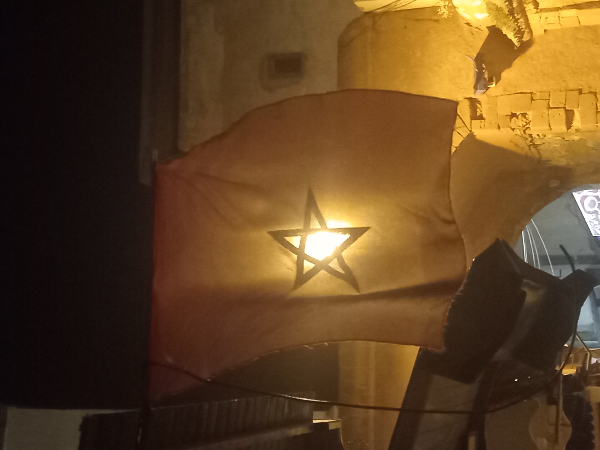 The image depicts a Moroccan flag, possibly illuminated from behind, hanging in Essaouira, Morocco