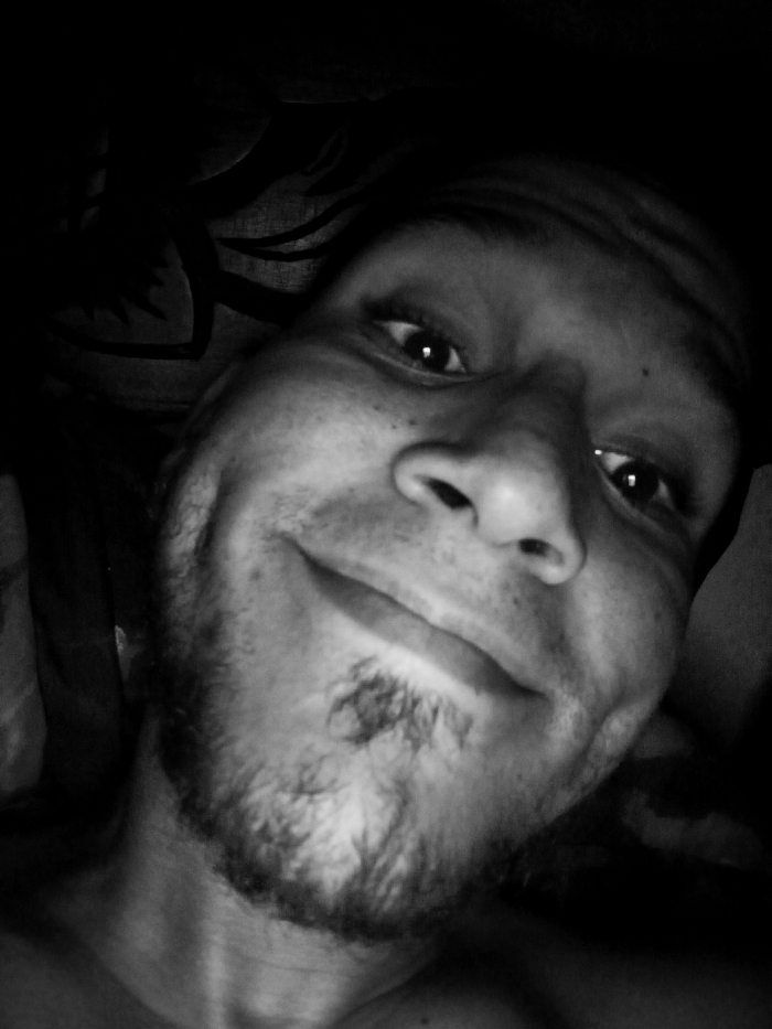 A close-up, black-and-white selfie reveals a smiling man with a goatee and stubble. He gazes directly at the camera with a slight tilt of his head. Lighting is dim, casting shadows around the edges of his face and highlighting his features. He has large eyes and a slightly crooked smile. A patterned fabric is vaguely visible behind his head.