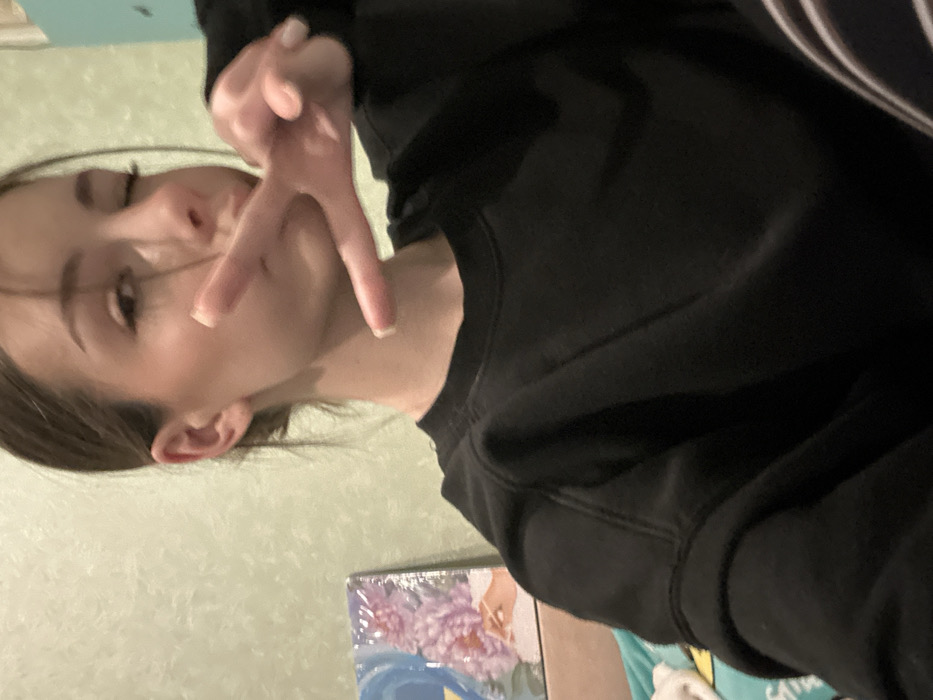 A young female is depicted in an indoor setting, identified as Kudrovo, Russia. She is shown from the chest up, facing the camera with her head slightly tilted. Her right eye is closed in a wink, and her right hand is raised to shoulder height, performing a peace sign (V-sign) with her index and middle fingers extended. Her fingernails exhibit light-colored tips, consistent with a French manicure. She wears a plain black long-sleeved crew-neck sweatshirt. A section of dark and light striped fabric, likely part of pants, is visible on the lower right of the frame. The background consists of a textured, light green or pale teal wall. To the upper left, behind her left shoulder, a partially visible framed artwork or print features light pink/purple floral elements against a blue background. The lighting appears to be internal and ambient.