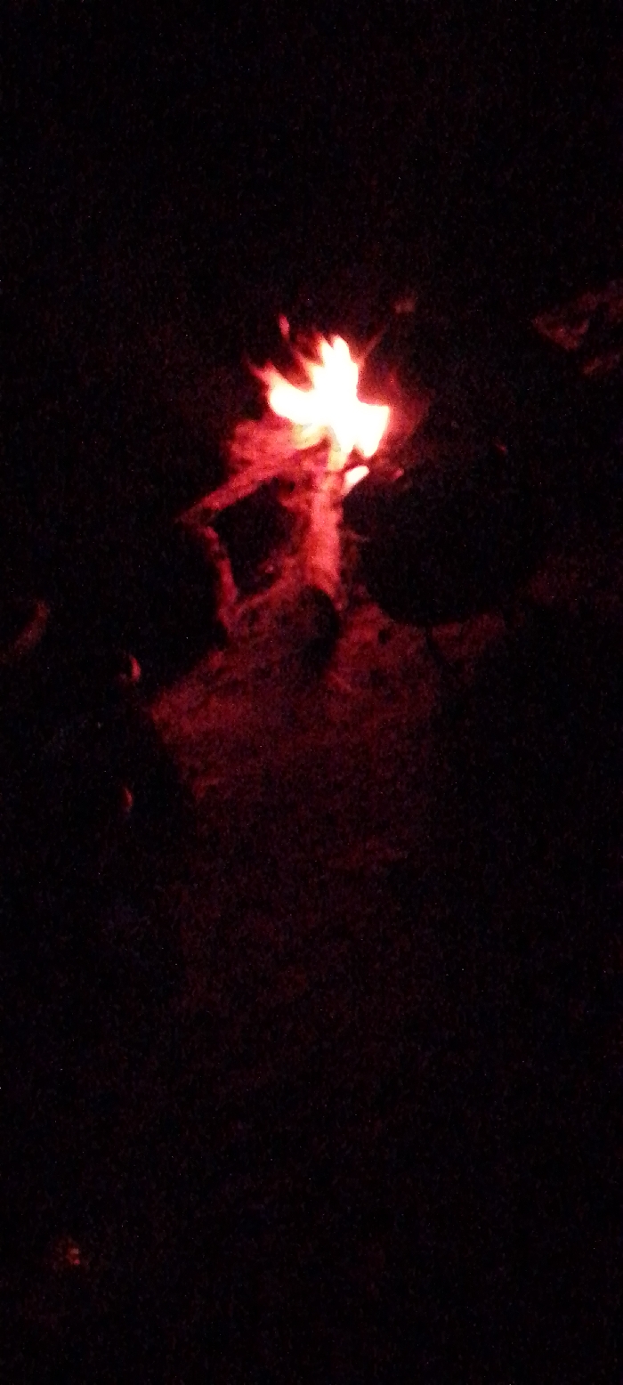 In a dark setting, a campfire burns with bright, white-yellow flames at the top, transitioning to a reddish glow as it descends. The surrounding ground appears to be covered in dirt or sand, reflecting the fire's light in a reddish hue. Logs or branches are visible beneath the flames, serving as fuel. The overall scene evokes a sense of warmth and solitude amidst the darkness.